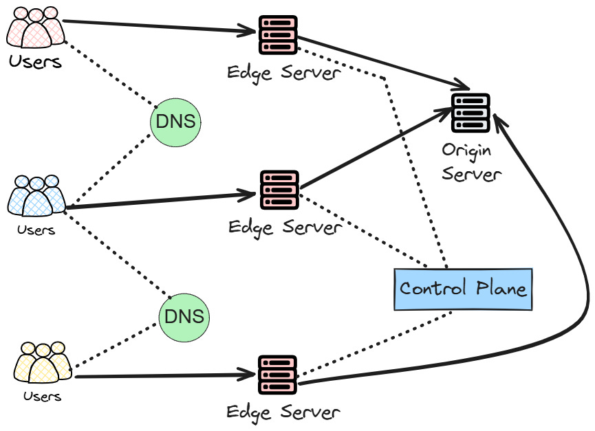 At their core, CDNs are distributed caching systems that work as an overlay network built on top of the internet. Before understanding what this exactly means and how DCNs work, let’s first have a look at their four main components: edge servers, origin servers, control plane and monitoring.