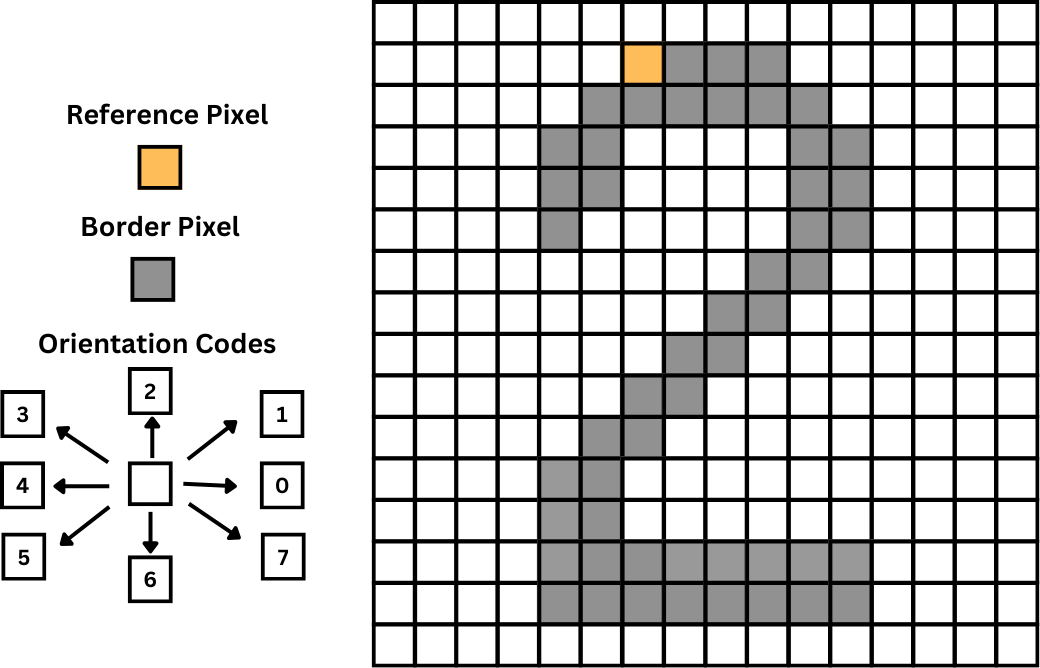 In the picture below, if we consider the orange pixel as a reference, the corresponding chain code would be: