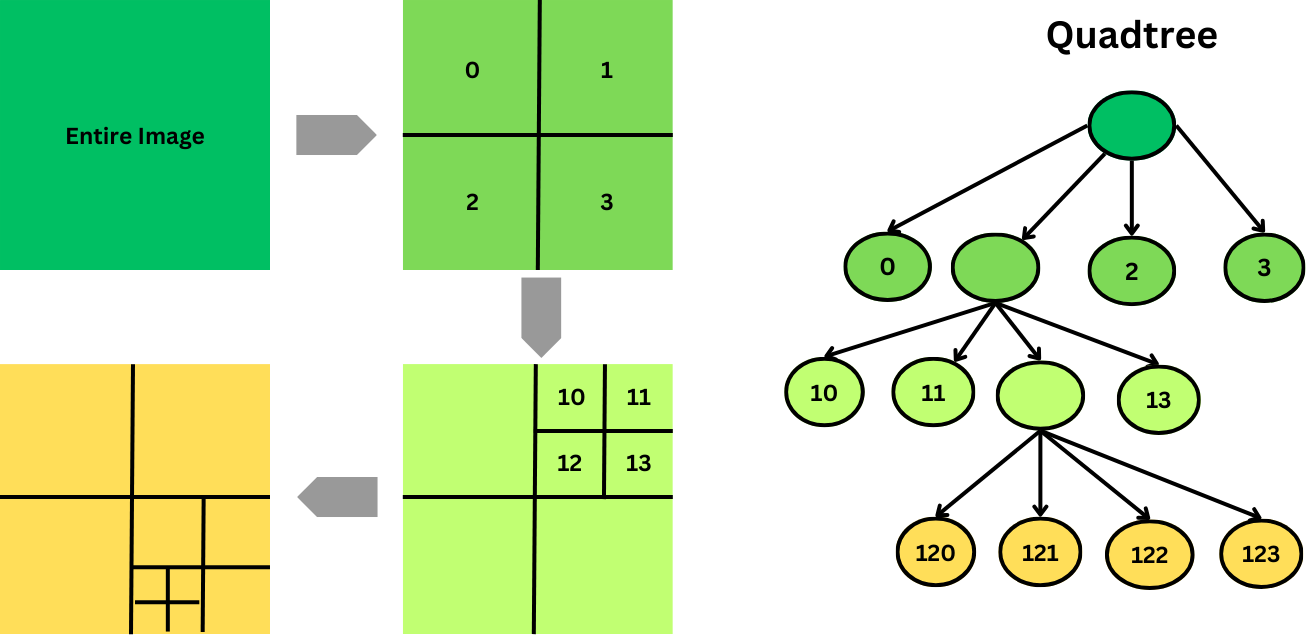 The basic idea is to divide an image into four quadrants recursively. If all pixels in a quadrant have the same value, that quadrant is represented by a single node. If not, the quadrant is further divided into four sub-quadrants. This process continues until all pixels in a sub-quadrant are homogeneous or a single pixel is reached.