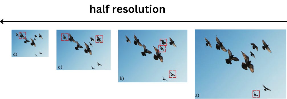 For example, in the picture below, the red box indicates the size of a template used for detecting flying birds. Since the template size is fixed, it can only detect the birds that tightly fit inside the box. Different birds are detected at different scales by running the same template across many levels in this pyramid.