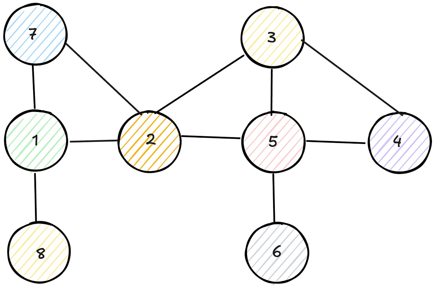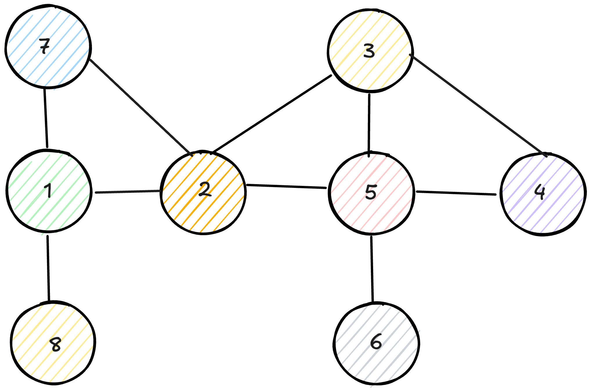 Let’s walk through an example using the graph with vertices (1-2), (1-7), (1-8), (2-3), (2-5), (3-4), (3-5), (4-5), (5-6).