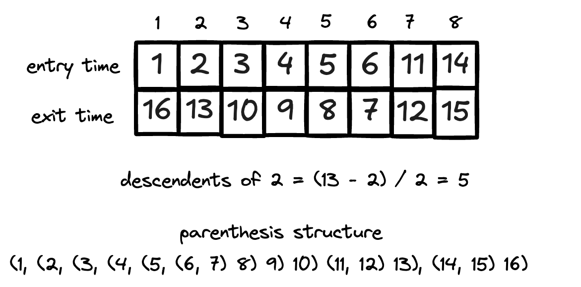 In addition, the difference between a vertex’s finishing and discovery times tells you how many descendants it has. Since the clock ticks on each entry and exit, half this difference gives the descendant count.