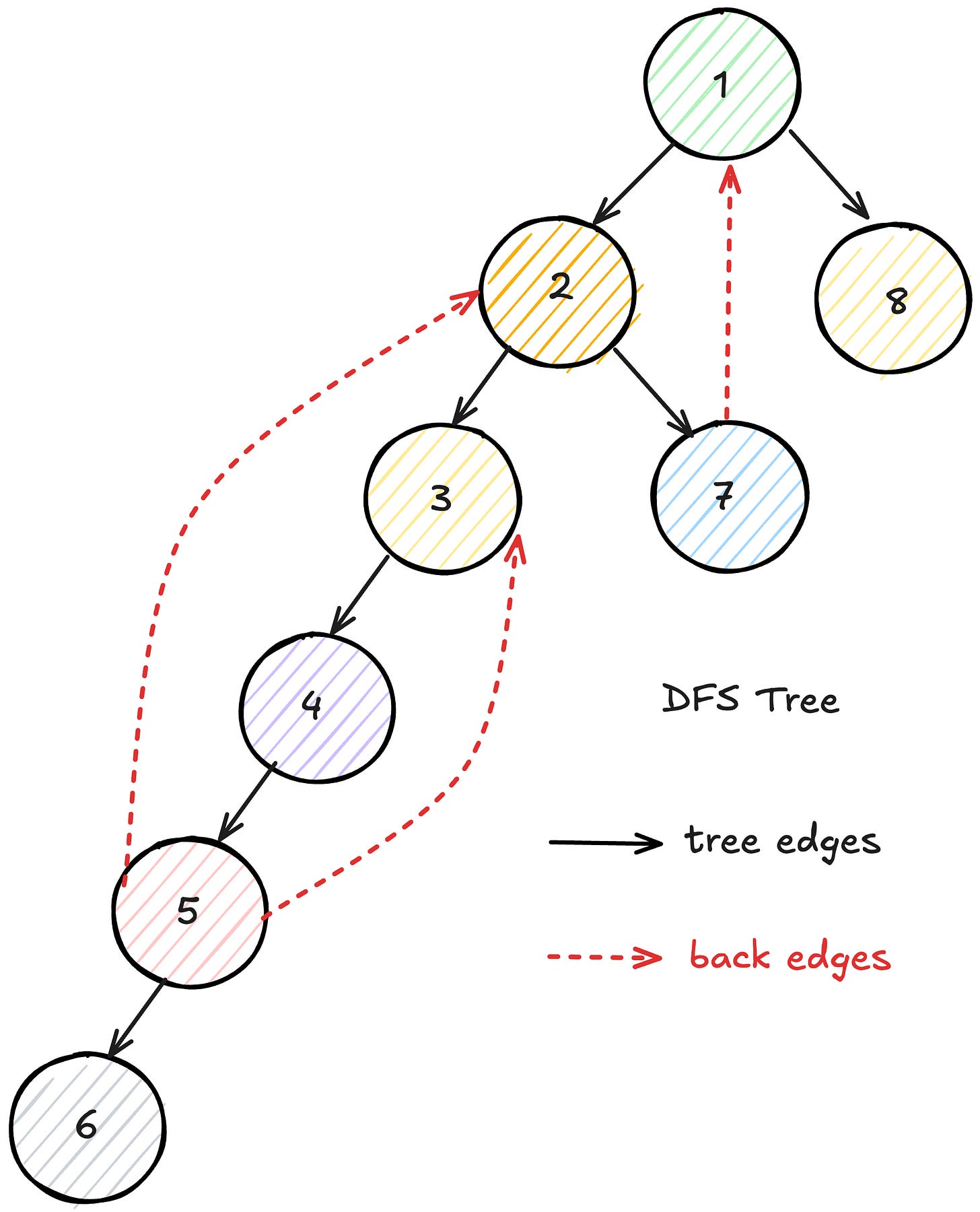 One subtle but important point: the order in which you examine neighbors matters. Different orderings can produce different DFS trees and different edge classifications, though tree and back edges remain consistent (the graph has the same shape). This is typically not a problem in practice because most DFS-based algorithms work correctly regardless of the specific ordering.