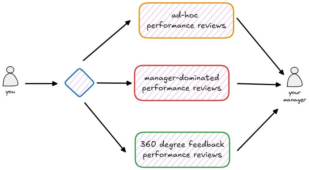 The 360-degree feedback system is what modern tech companies use. The idea is that feedback comes from all directions: