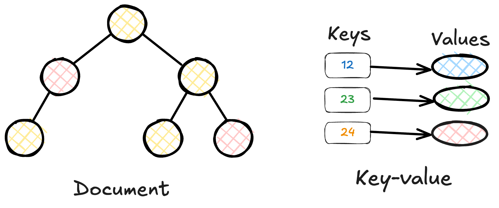 A key-value store maps a sequence of bytes (the key) to another sequence of bytes (the value). A document store maps a key to a document, which can have a hierarchy but doesn’t have a strict schema. The main difference between a document and a key-value store is that documents are read and indexed, which means that they can be searched for based on what they contain.