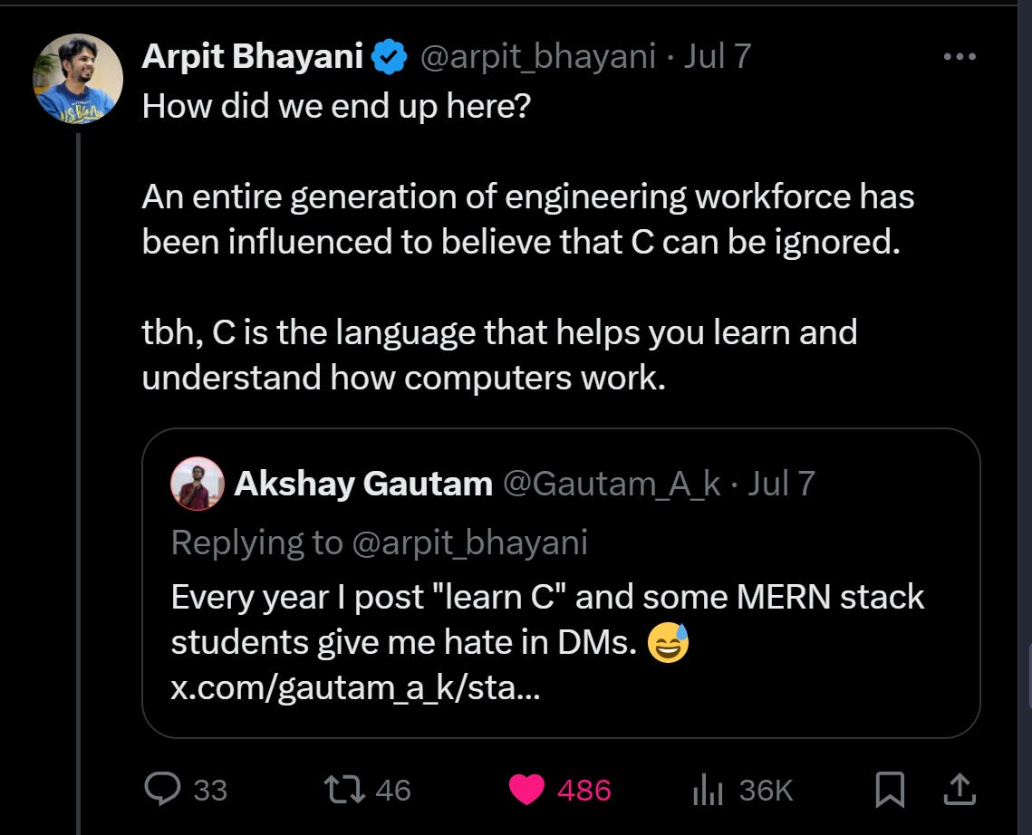 The first programming language I learned was C, and if I had to pick a first language as a beginner, I’d still go with it. It gives you nothing but a few built-in keywords, and you need to understand everything else. Plus, many other languages are C derivative or inspired.