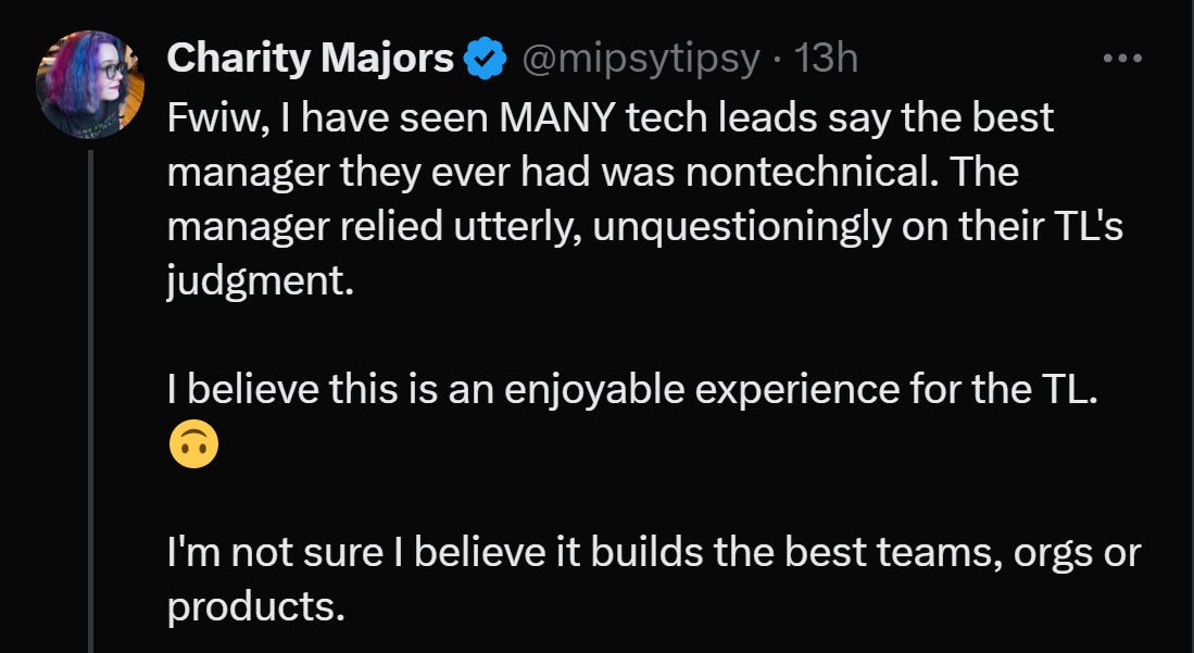 When I wasn't yet a senior engineer, I had some bad experiences with nontechnical managers. First, they couldn't fully understand some dynamics inside the team. Second, they couldn't fully assess how hard my work was and its quality. Link