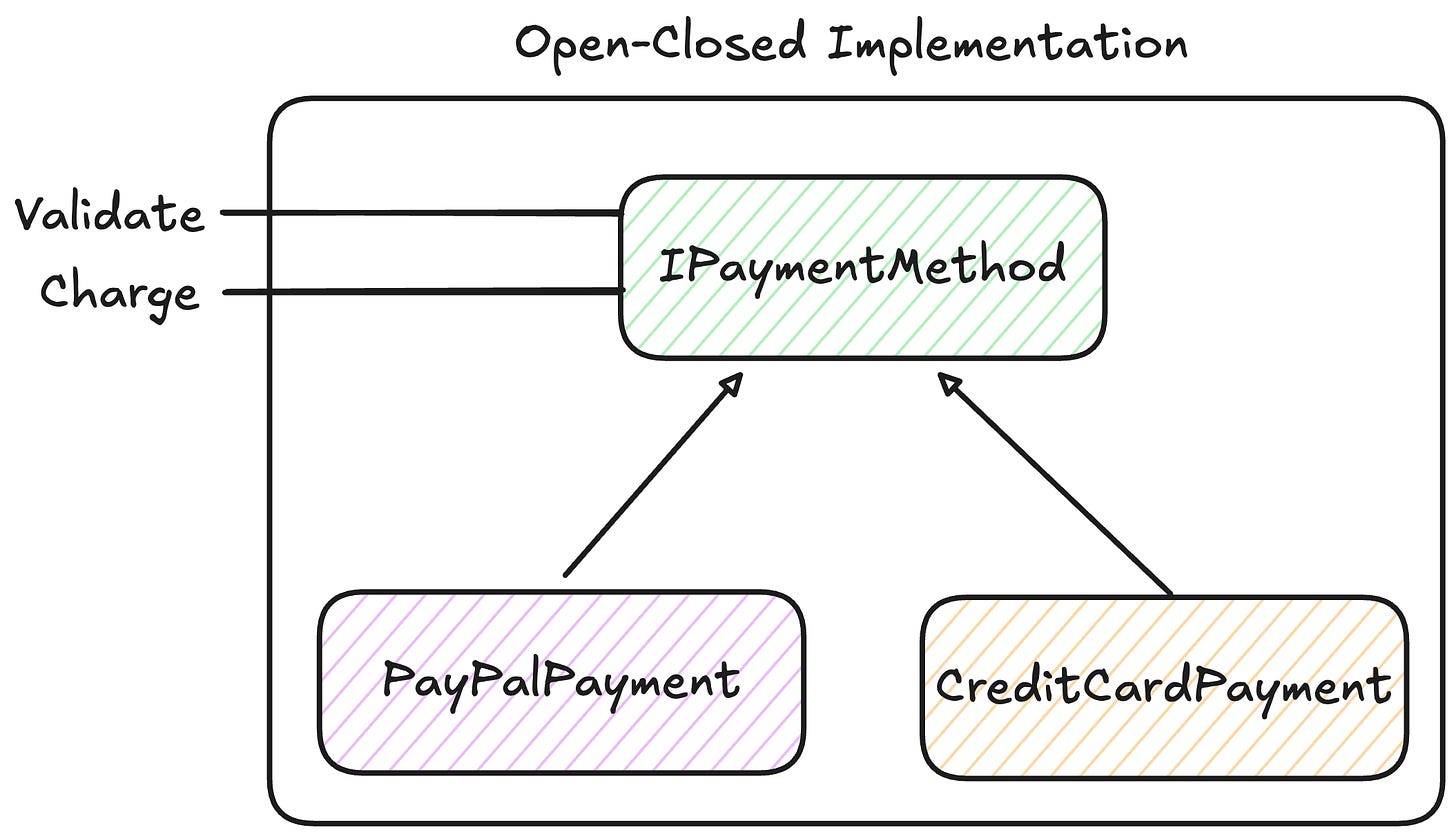 Now, to add support for a different payment method, all you have to do is make a new class that uses IPaymentMethod. You don’t change PaymentProcessor or any payment methods that are already set up. The PaymentProcessor is closed for modification but open for extension. The principle allows you to keep more options available and delay decisions about the details, so you don't have to change as much code.