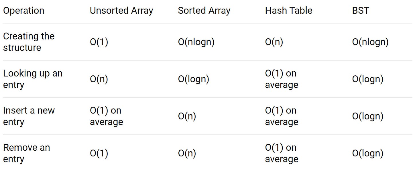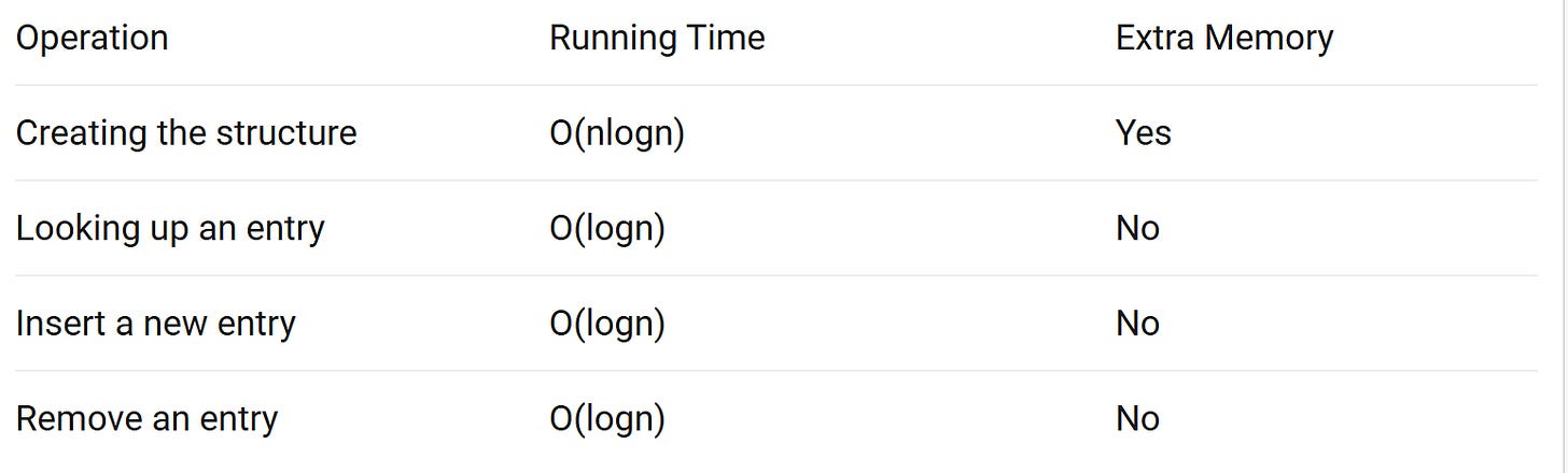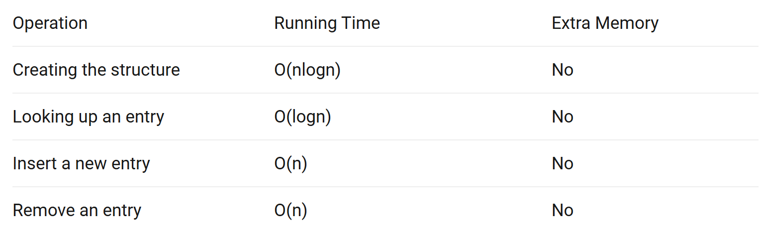 Sorted arrays are a solid option when the data doesn’t change. You pay the O(n log n) cost once to sort, and then you get O(log n) lookups with no extra memory. But if you need to add or remove things often, the O(n) cost makes those operations impractical.