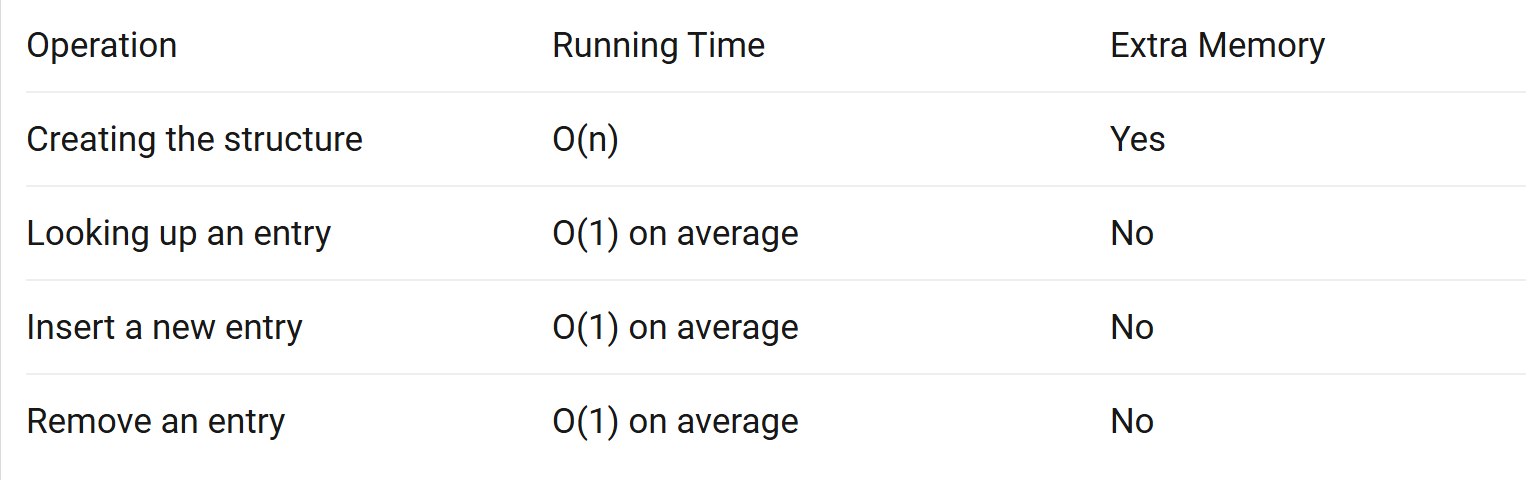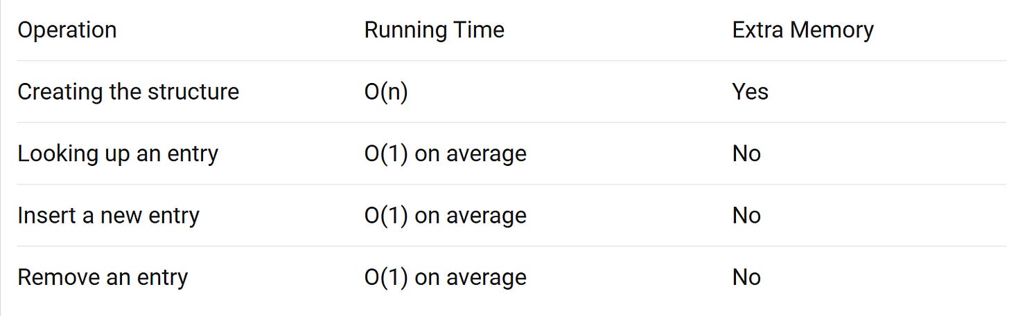 With O(1) on average for all the operations that matter, hash tables seem like the clear winner. But they come with a cost: memory. A hash table needs an array that is larger than the number of elements you plan to store, plus extra space to deal with collisions.