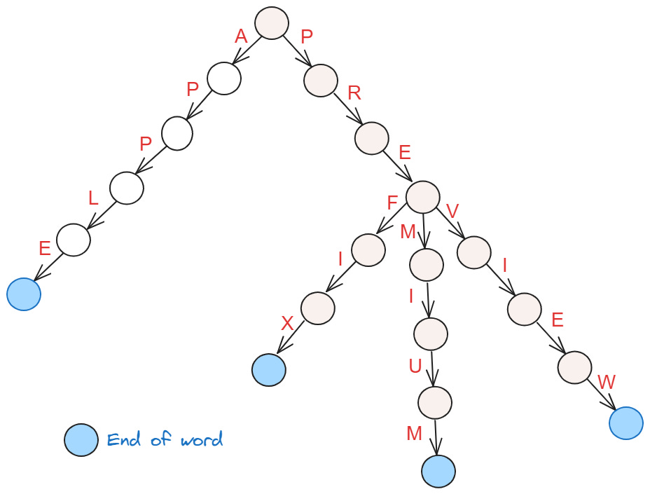 root.isEnd = TrueTo search a given word, you proceed similarly by iterating over its characters and moving along the nodes and edges of the trie.
